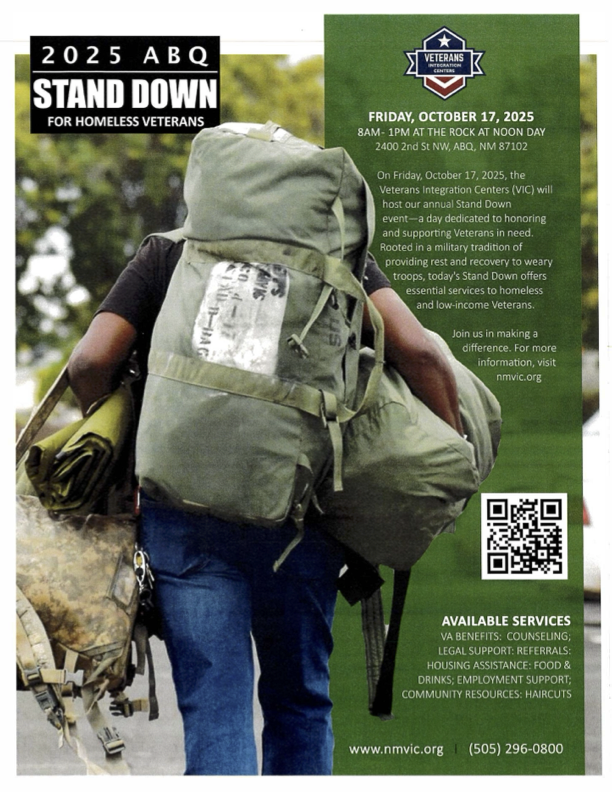 Stand Down For Homeless Veterans Friday, October 17, 2025 8:00 AM 1:00 PM The Rock at Noon Day 2400 2nd Street Northwest Albuquerque, NM, 87102 United States (map) Google Calendar ICS